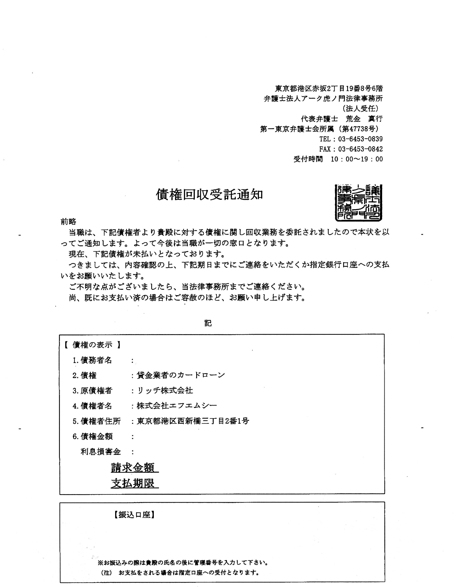 弁護士法人アーク虎ノ門法律事務所が、当初の貸金業者から債権を譲り受けた株式会社エフエムシーから回収業務を受託しているケースもあります。