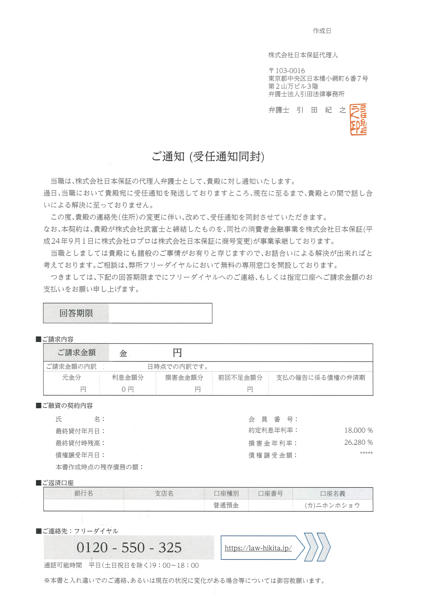 引田法律事務所が代理人をしている場合があり、その際は「受任通知書」が届きます。