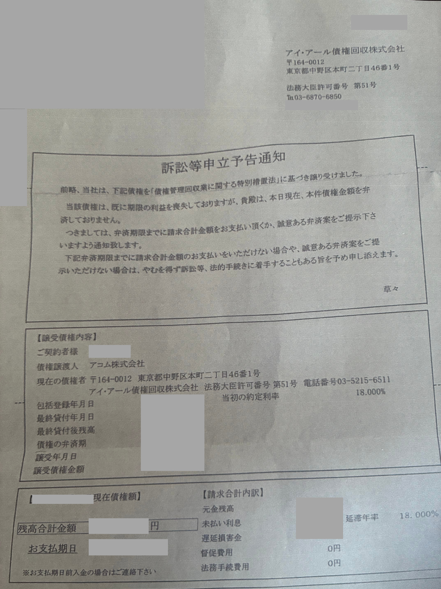 - 0.14.3. アイアール債権回収からアコムの「債権譲渡通知書」が届いたケース