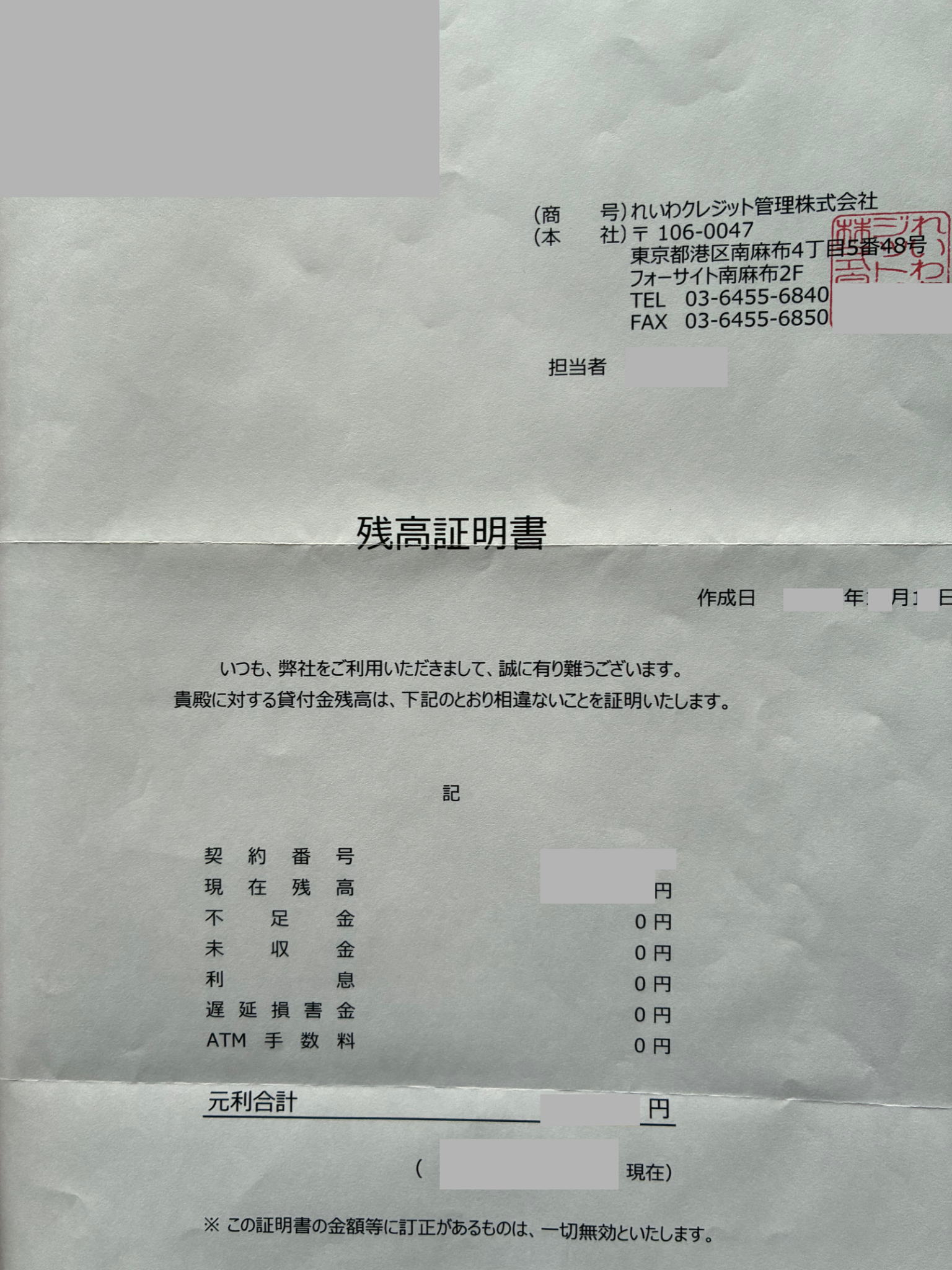 れいわクレジット管理株式会社から届いた「お知らせ」には、4通の「残高証明書」が同封されていました。